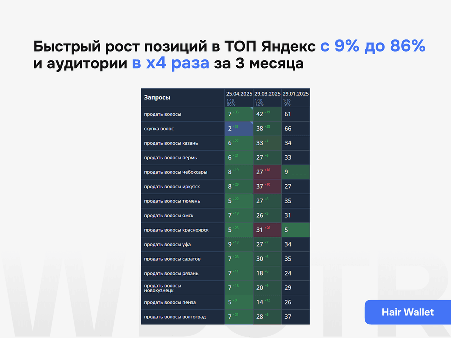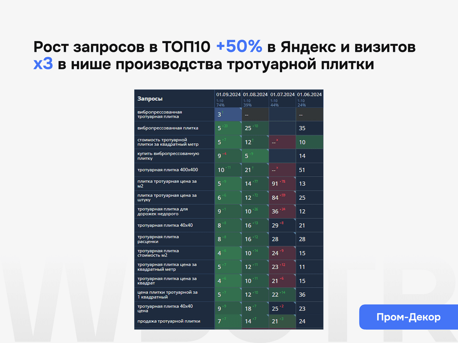 • Ежемесячный контроль позиций, показов, кликов и динамики по согласованному списку ключевых слов